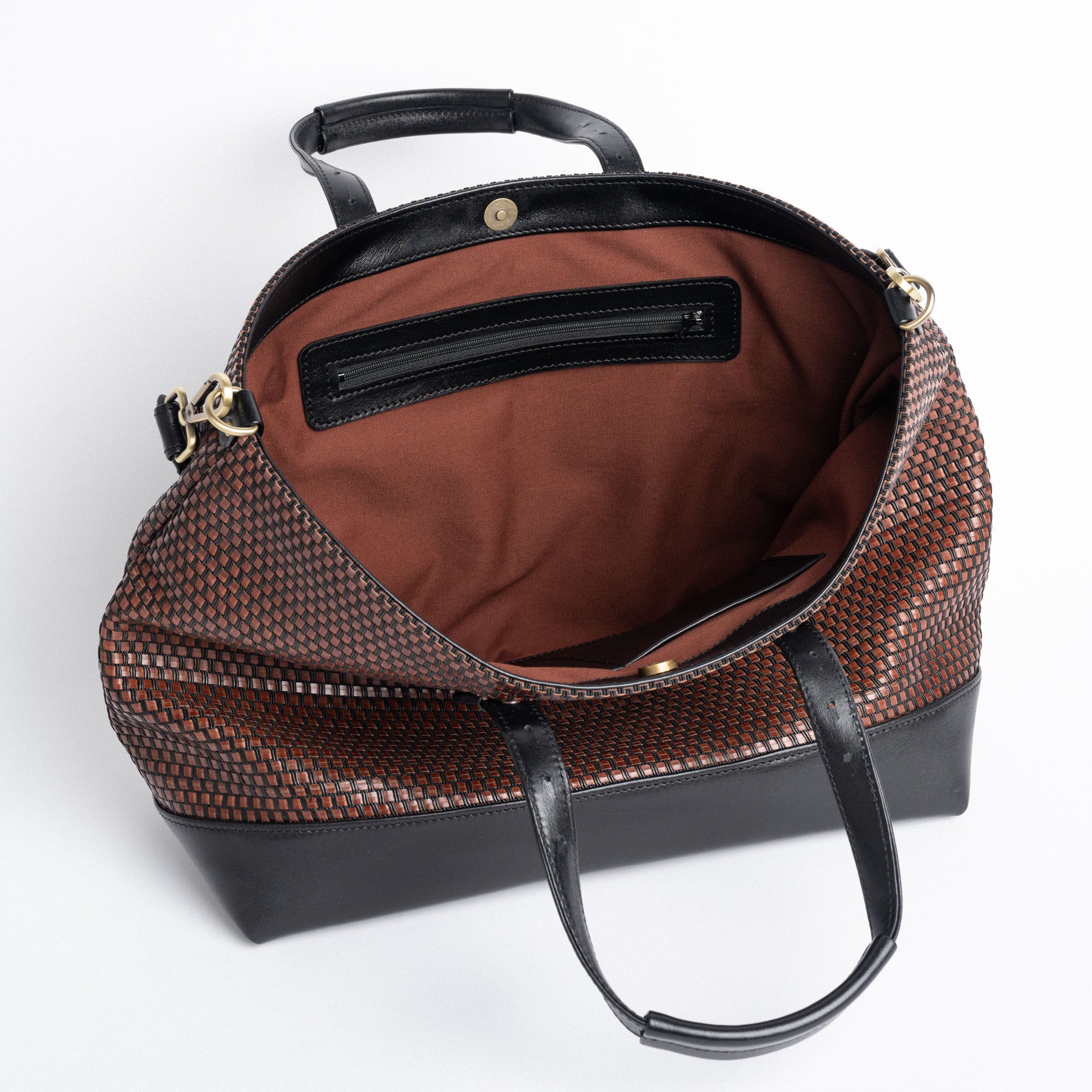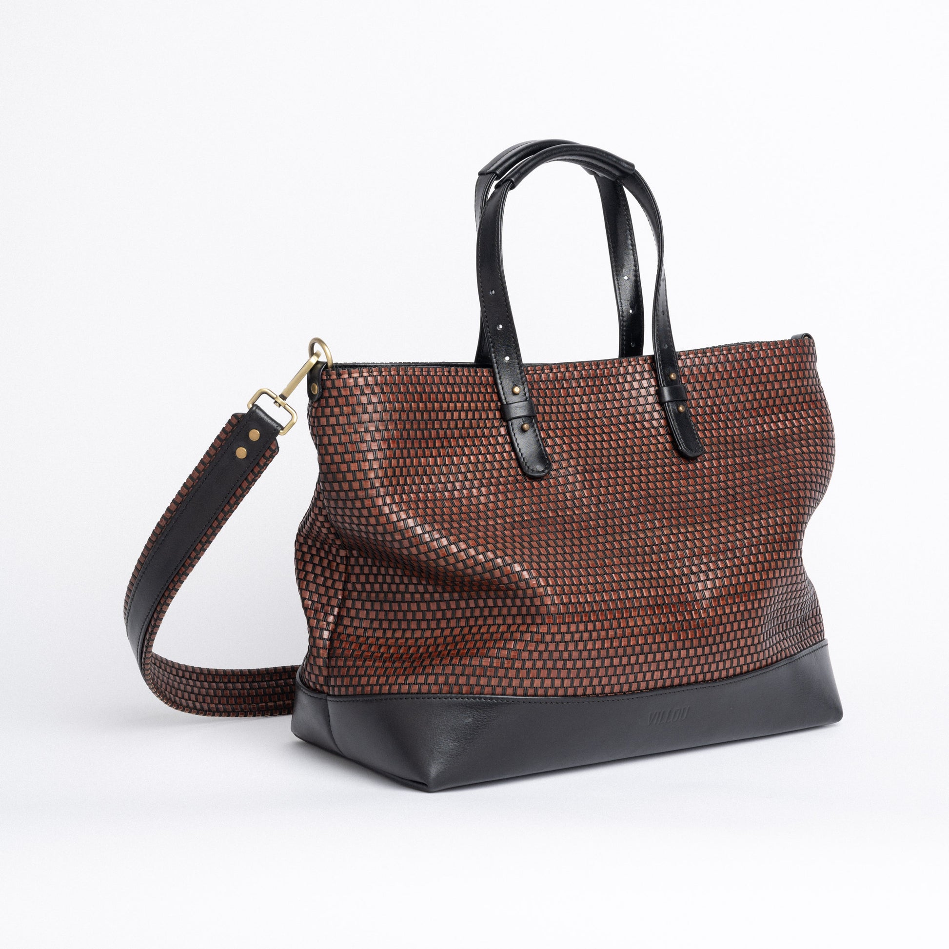 • premium quality vegetable-tanned black and brown woven leather;