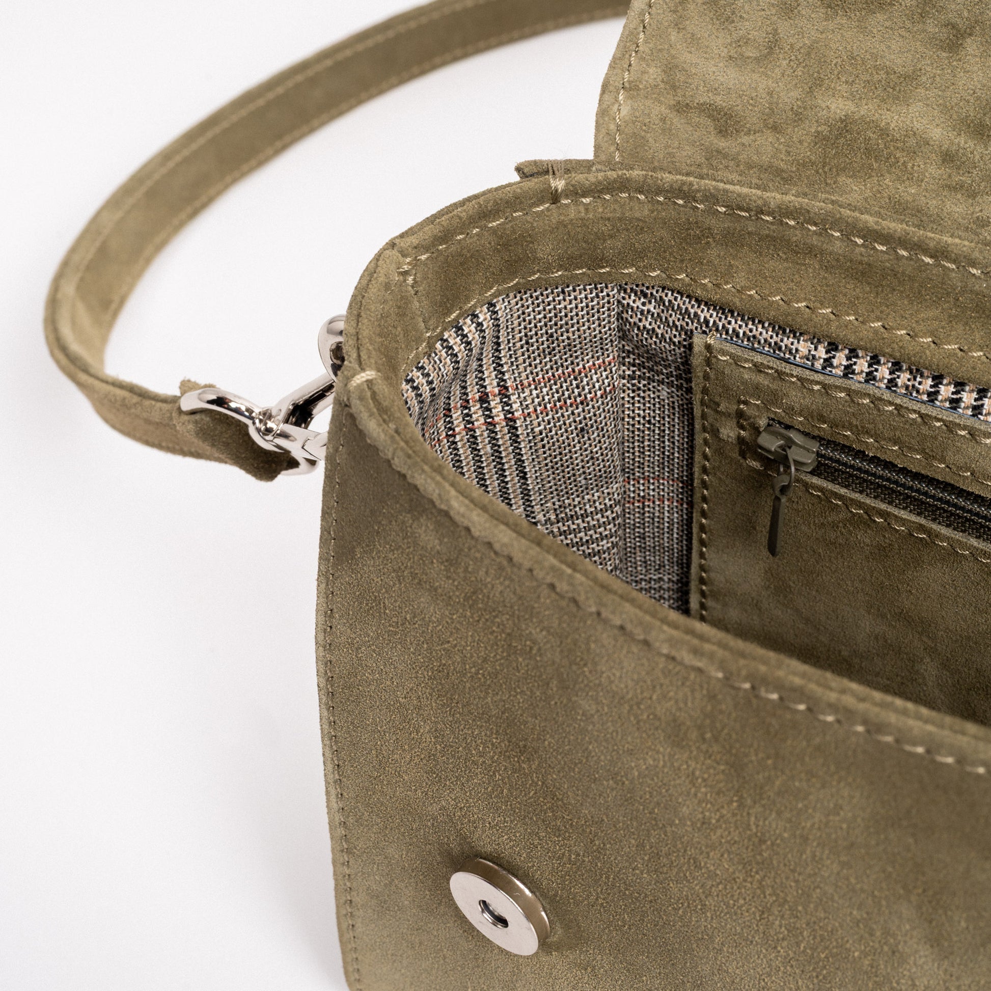 The adjustable and detachable shoulder strap offers styling versatility, while thoughtful interior and exterior pockets keep essentials close, including a discreet pocket under the flap for easy access.